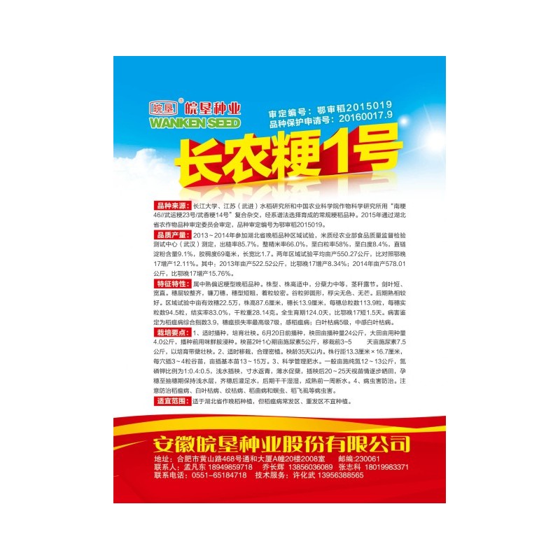 品種審定編號:鄂審稻2015019、(蘇)引種(2019)第047號、皖引稻2019093