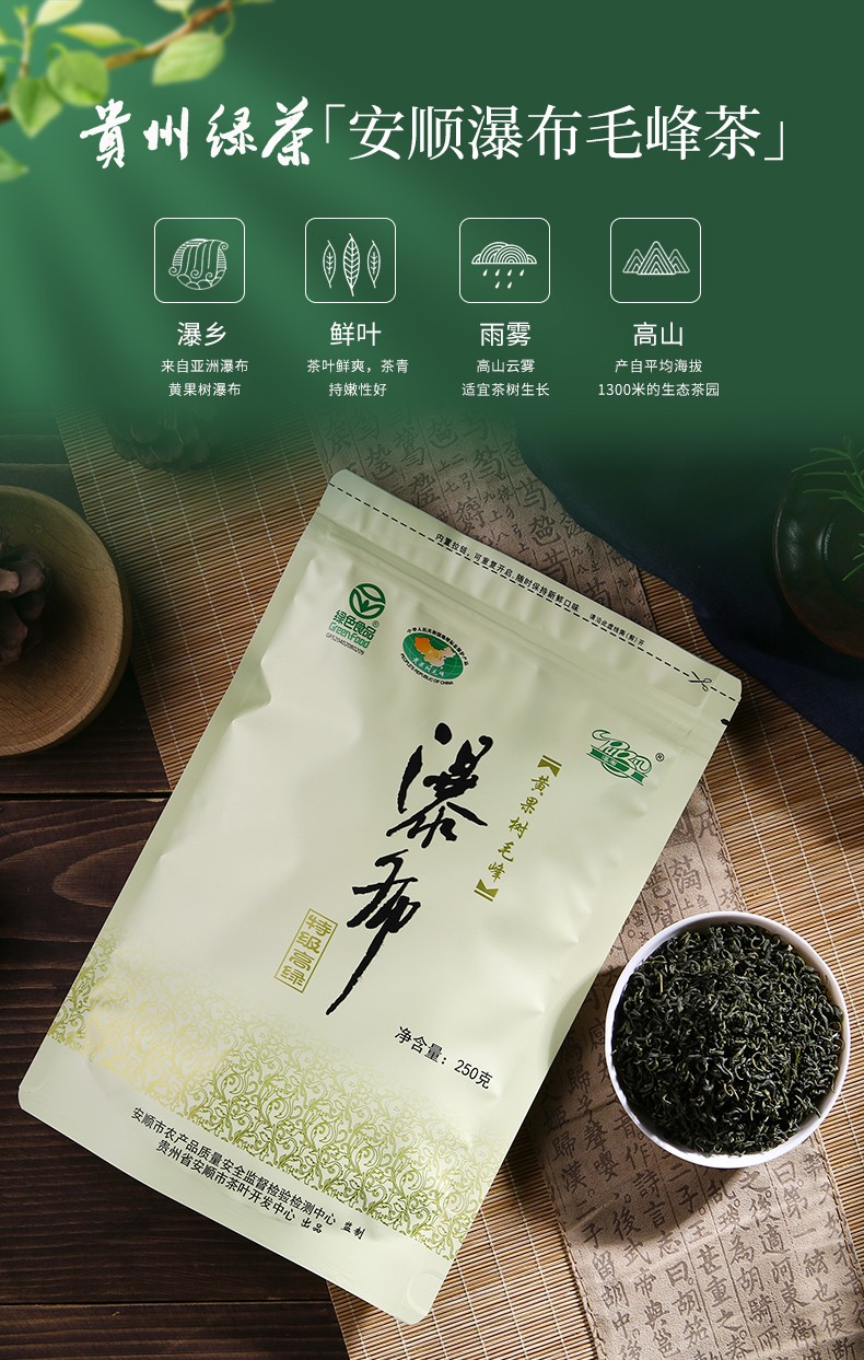 瀑布茶品牌是安順市人民政府主打茶葉品牌,省級重點打造區域公共品牌,屬貴州五大名茶,先后獲得獲“中國農產品區域公用品牌”、“貴州省著名商標”“貴州省名牌產品”等榮譽稱號近年來,在各級部門大力推動下,瀑布茶品牌不斷發展壯大。截止目前,現有瀑布茶品牌加盟企業23家,輻射茶園面積200000余畝其中綠色食品認證茶園基地面積7000余畝,有機食品認證基地面積2500畝擁有“瀑布毛峰”、“瀑布翠芽”“瀑布紅茶”、“瀑布翠龍”等產品,多次獲得“中綠杯”、“中茶杯”、“華茗杯”大獎;分別榮獲14屆中國國際農產品交易會金獎18屆中國綠色食品博覽會金獎“黃山杯”首屆全國傳統名茶產品質量特別金獎、安順十大旅游商品等殊榮及稱號。