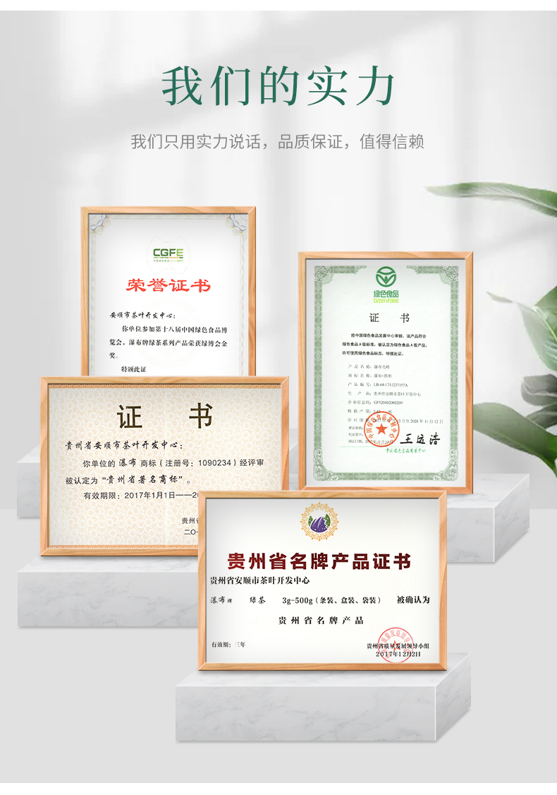 瀑布茶品牌是安順市人民政府主打茶葉品牌,省級重點打造區域公共品牌,屬貴州五大名茶,先后獲得獲“中國農產品區域公用品牌”、“貴州省著名商標”“貴州省名牌產品”等榮譽稱號。近年來,在各級部門大力推動下,瀑布茶品牌不斷發展壯大。截止目前,現有瀑布茶品牌加盟企業23家,輻射茶園面積200000余畝其中綠色食品認證茶園基地面積7000余畝,有機食品認證基地面積2500畝。擁有“瀑布毛峰”、“瀑布翠芽”“瀑布紅茶”、“瀑布翠龍”等產品,多次獲得“中綠杯”、“中茶杯”、“華茗杯”大獎;分別榮獲14屆中國國際農產品交易會金獎18屆中國綠色食品博覽會金獎、“黃山杯”首屆全國傳統名茶產品質量特別金獎、安順十大旅游商品等殊榮及稱號。