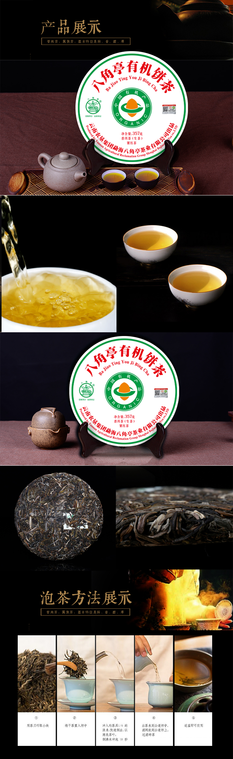 八角亭茶業原為黎明農工商聯合公司(黎明農場)下屬茶葉加工組,始于一九六四年,從事茶葉產品開發生產五十余載,一九八四年建成標準化工廠,二00一年開始生產普洱茶,截止到2013年,公司累計生產各種普洱茶數百個品種共12000余噸。