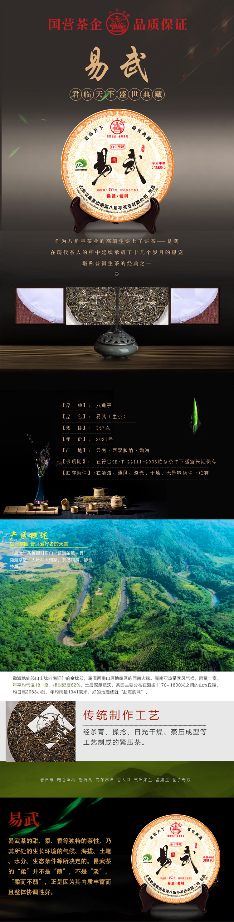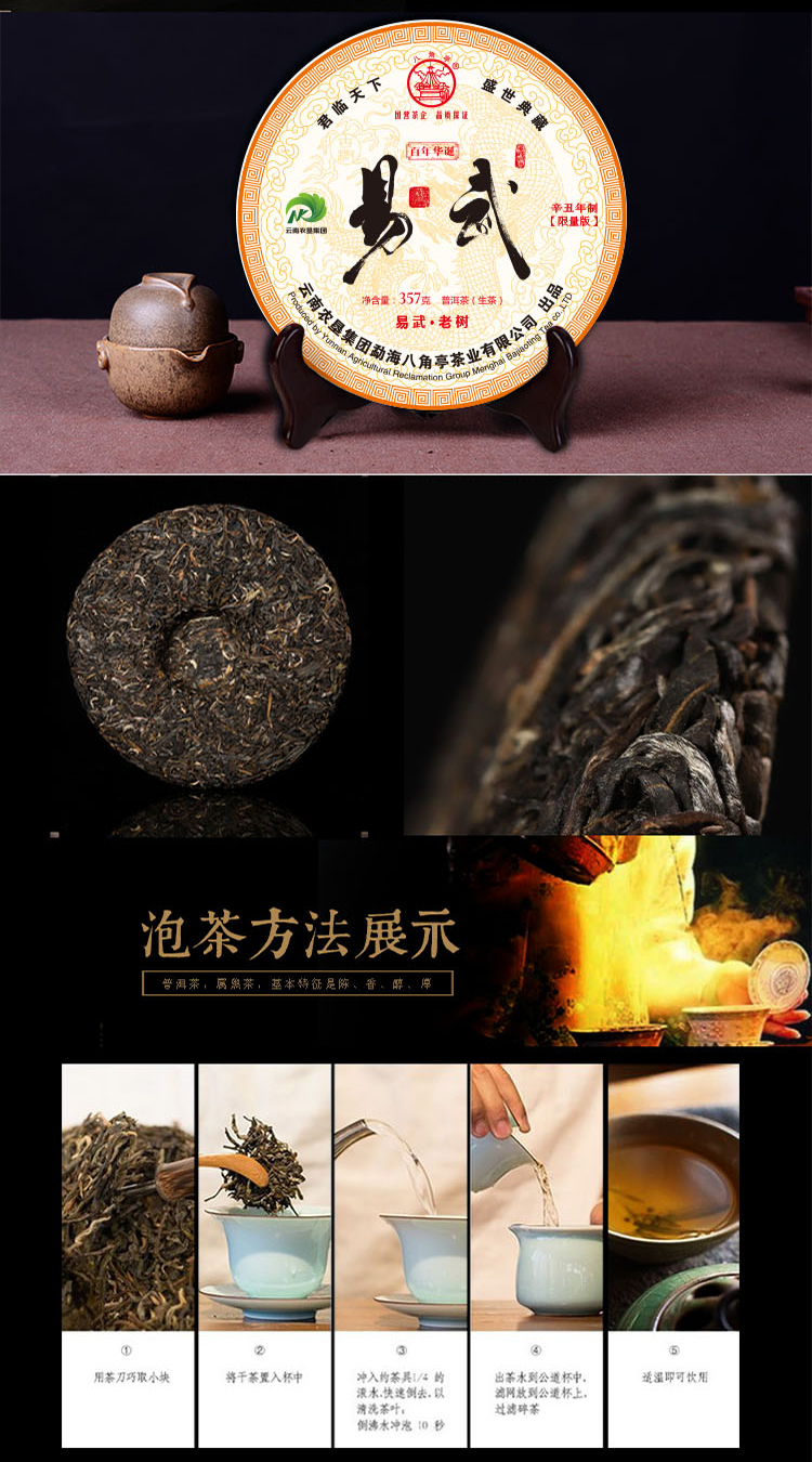 ??——八角亭茶業(yè)公司:經(jīng)營方式為生產(chǎn)加工、銷售,主營普洱茶、緊壓茶、兼營毛茶收購。目前以生產(chǎn)、加工、銷售“八角亭”系列普洱茶為主,是云南省農(nóng)業(yè)產(chǎn)業(yè)化龍頭企業(yè)?!鞍私峭ぁ鄙虡双@得云南省著名商標,“八角亭”牌普洱茶榮獲云南省名牌產(chǎn)品和云南省名牌農(nóng)產(chǎn)品。已先后通過工業(yè)生產(chǎn)許可證、ISQ9001與HCCP認證、云茶牌認證(YC)等項工作,在歷次專業(yè)評比中“八角亭”普洱茶多次獲得特等金獎和金獎。2017年5月,“八角亭”牌老班章茶葉獲得了有機茶資格認證。八角亭茶業(yè)公司多次進行了技術(shù)改造,現(xiàn)已建立了標準化生產(chǎn)車間和設(shè)備,年設(shè)計生產(chǎn)量達3000噸,是整個公司的主體核心企業(yè)。