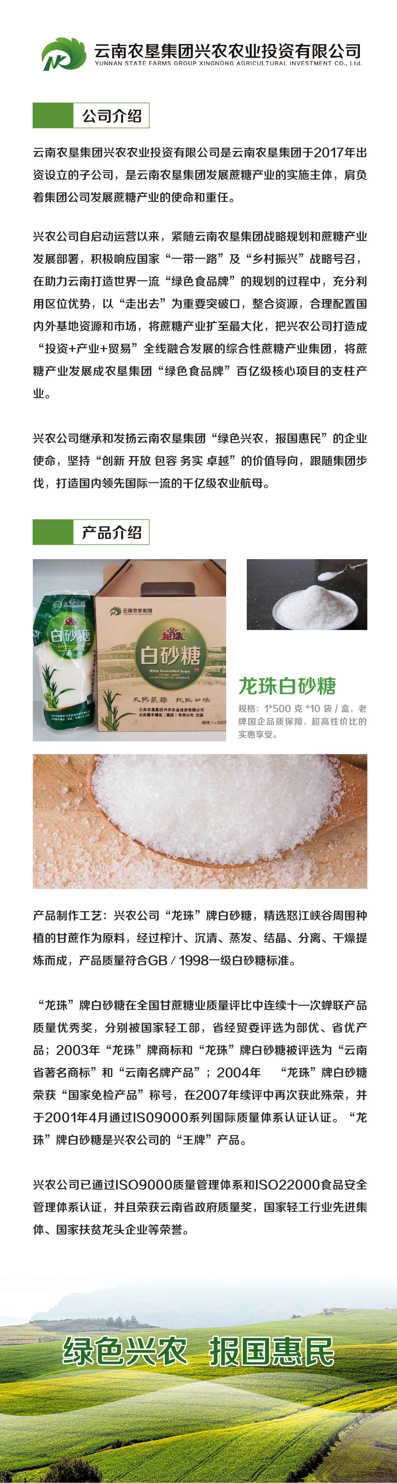 興農公司自啟動運營以來,緊隨云南農墾集團戰略規劃和蔗糖產業發展部署,積極響應國家“ 一帶一路”及“鄉村振興”戰略號召,在助力云南打造世界一流“綠色食品牌”的規劃的過程中,充分利用區位優勢,以“走出去”為重要突破口,整合資源,合理配置國內外基地資源和市場,將蔗糖產業擴至最大化,把興農公司打造成“投資+產業+貿易”全線融合發展的綜合性蔗糖產業集團,將蔗糖產業發展成農墾集團“綠色食品牌”百億級核心項目的支柱產業。興農公司繼承和發揚云南農墾集團“綠色興農,報國惠民”的企業使命,堅持“創新、開放、包容、務實、卓越”的價值導向,跟隨集團步伐,打造國內領先國際一流的千億級農業航母。