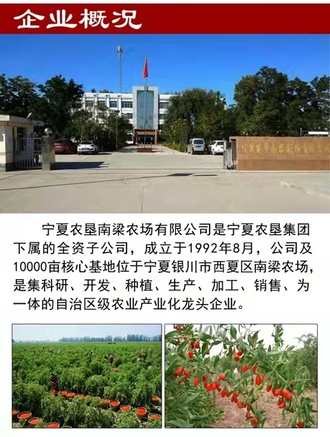 寧夏農(nóng)墾南梁農(nóng)場有限公司成立于1992年10月,隸屬于寧夏農(nóng)墾集團(tuán)有限公司,是集科研、開發(fā)、種植、生產(chǎn)、加工、銷售為一體的自治區(qū)級農(nóng)業(yè)產(chǎn)業(yè)化龍頭企業(yè)。南梁枸杞已有50多年的栽培歷史,所產(chǎn)枸杞以粒大、肉厚、籽少、味甜、藥效高而享譽全國。 南梁農(nóng)場枸杞基地先后被國家、自治區(qū)確立為“萬畝優(yōu)質(zhì)富硒枸杞生產(chǎn)基地”,“農(nóng)業(yè)部無公害農(nóng)產(chǎn)品示范基地農(nóng)場”,“全國農(nóng)業(yè)標(biāo)準(zhǔn)化示范基地”,“自治區(qū)農(nóng)業(yè)產(chǎn)業(yè)化重點龍頭企業(yè)”等稱號。公司主要產(chǎn)品為“碧寶牌” SOD富硒枸杞、“南梁”牌枸杞。主導(dǎo)產(chǎn)品“碧寶牌” SOD富硒枸杞獲得國家專利和綠色食品證書,多次獲得中國農(nóng)業(yè)博覽會金獎、馬來西亞國際金獎、兩屆中國專利新技術(shù)新產(chǎn)品博覽會金獎在內(nèi)的多項國際國內(nèi)金獎。